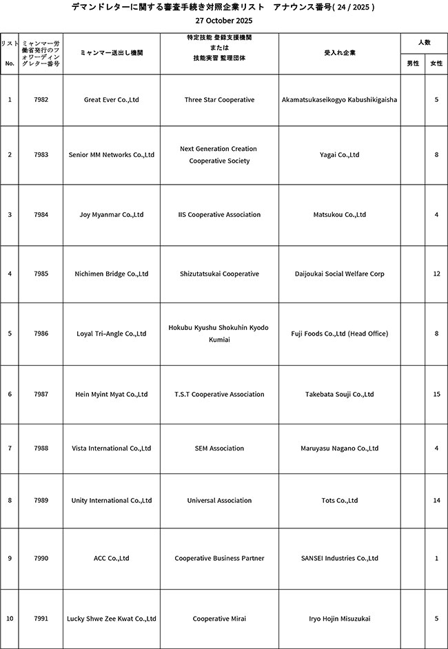 Demand Letter စိစစ်နိုင်ရန်အတွက် စာရွက်စာတမ်းများ ပေးပို့နိုင်သည့် ဂျပန်ကုမ္ပဏီများစာရင်းထုတ်ပြန်ခြင်း (24/2025)