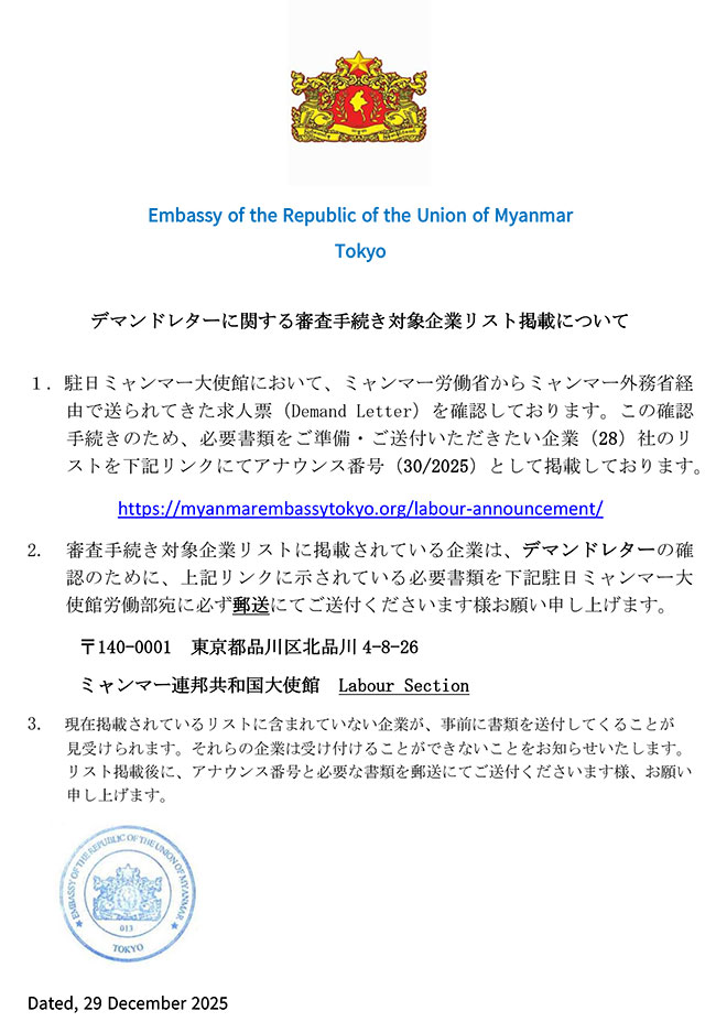 Demand Letter စိစစ်နိုင်ရန်အတွက် စာရွက်စာတမ်းများ ပေးပို့နိုင်သည့် ဂျပန်ကုမ္ပဏီများစာရင်းထုတ်ပြန်ခြင်း (30/2025) Myanmar Embassy Websites Bandar Seri Begawan Beijing Brussels Belgrade Berlin Brasilia Cairo Canberra Dhaka Hanoi Kathmandu Islamabad London Kuala Lumpur Kuwait New Delhi Manila Moscow Oslo Ottawa Riyadh Phnom Penh Prague Pretoria Singapore Rome Seoul Tel Aviv Tokyo Vienna Vientiane Washington Geneva Chiang Mai Jakarta Hong Kong Kolkata Kunming Los Angeles Nanning Online Appointment (ရက်ချိန်းရယူခြင်း) Home About Myanmar Trade Information Services Gallery Contact Us မြန်မာသံရုံး Online Appointment System ၌ ကြိုတင်ရက်ချိန်းရယူခြင်းနှင့် ကောင်စစ်ဆိုင်ရာဝန်ဆောင်မှုများနှင့်ပတ်သက်၍ အသိပေးကြေညာခြင်း Demand Letter စိစစ်နိုင်ရန်အတွက် စာရွက်စာတမ်းများ ပေးပို့နိုင်သည့် ဂျပန်ကုမ္ပဏီများစာရင်းထုတ်ပြန်ခြင်း (30/2025) ဆက်လက်ဖတ်ရှုရန် Myanmar Ministry Websites Ministry of Defence Ministry of Home Affairs Ministry of Foreign Affairs Ministry of Union Government Office(1) Ministry of Union Government Office(2) Ministry of Border Affairs Ministry of Planning and Finance Ministry of Investment and Foreign Economic Relations Ministry of Legal Affairs Ministry of Information Ministry of Religious Affairs and Culture Ministry of Agriculture, Livestock and Irrigation Ministry of Cooperatives and Rural Development Ministry of Transport and Communication Ministry of National Resources and Environmental Conservation Ministry of Electricity and Energy Ministry of Industry Ministry of Immigration and Population Ministry of Labour Ministry of Commerce Ministry of Education Ministry of Science and Technology Ministry of Health Ministry of Sports and Youth Affairs Ministry of Construction Ministry of Social Welfare, Relief and Resettlement Ministry of Hotels and Tourism Ministry of Ethnic Affairs Useful Information Government of Myanmar ဂျပန်နိုင်ငံရှိ ထင်ရှားသော ဘာသာရေး အဆောက်အဦများ Findings Embassy's newsletter FAQs