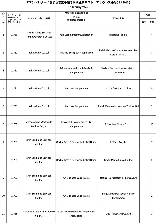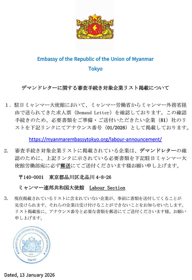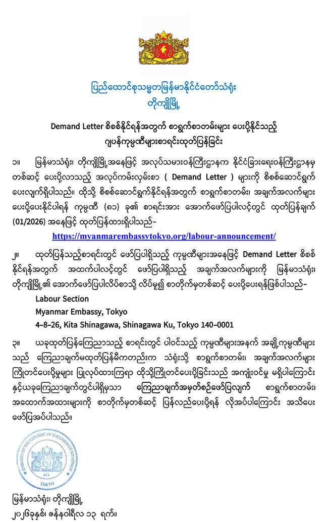 Myanmar Embassy Websites Bandar Seri Begawan Beijing Brussels Belgrade Berlin Brasilia Cairo Canberra Dhaka Hanoi Kathmandu Islamabad London Kuala Lumpur Kuwait New Delhi Manila Moscow Oslo Ottawa Riyadh Phnom Penh Prague Pretoria Singapore Rome Seoul Tel Aviv Tokyo Vienna Vientiane Washington Geneva Chiang Mai Jakarta Hong Kong Kolkata Kunming Los Angeles Nanning Online Appointment (ရက်ချိန်းရယူခြင်း) Home About Myanmar Trade Information Services Gallery Contact Us မြန်မာသံရုံး Online Appointment System ၌ ကြိုတင်ရက်ချိန်းရယူခြင်းနှင့် ကောင်စစ်ဆိုင်ရာဝန်ဆောင်မှုများနှင့်ပတ်သက်၍ အသိပေးကြေညာခြင်း Demand Letter စိစစ်နိုင်ရန်အတွက် စာရွက်စာတမ်းများ ပေးပို့နိုင်သည့် ဂျပန်ကုမ္ပဏီများစာရင်းထုတ်ပြန်ခြင်း (1/2026) ဆက်လက်ဖတ်ရှုရန် Myanmar Ministry Websites Ministry of Defence Ministry of Home Affairs Ministry of Foreign Affairs Ministry of Union Government Office(1) Ministry of Union Government Office(2) Ministry of Border Affairs Ministry of Planning and Finance Ministry of Investment and Foreign Economic Relations Ministry of Legal Affairs Ministry of Information Ministry of Religious Affairs and Culture Ministry of Agriculture, Livestock and Irrigation Ministry of Cooperatives and Rural Development Ministry of Transport and Communication Ministry of National Resources and Environmental Conservation Ministry of Electricity and Energy Ministry of Industry Ministry of Immigration and Population Ministry of Labour Ministry of Commerce Ministry of Education Ministry of Science and Technology Ministry of Health Ministry of Sports and Youth Affairs Ministry of Construction Ministry of Social Welfare, Relief and Resettlement Ministry of Hotels and Tourism Ministry of Ethnic Affairs Useful Information Government of Myanmar ဂျပန်နိုင်ငံရှိ ထင်ရှားသော ဘာသာရေး အဆောက်အဦများ Findings Embassy's newsletter FAQs