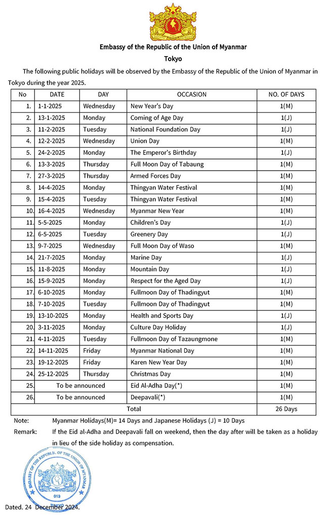Myanmar Embassy Websites Bandar Seri Begawan Beijing Brussels Belgrade Berlin Brasilia Cairo Canberra Dhaka Hanoi Kathmandu Islamabad London Kuala Lumpur Kuwait New Delhi Manila Moscow Oslo Ottawa Riyadh Phnom Penh Prague Pretoria Singapore Rome Seoul Tel Aviv Tokyo Vienna Vientiane Washington Geneva Chiang Mai Jakarta Hong Kong Kolkata Kunming Los Angeles Nanning Online Appointment (ရက်ချိန်းရယူခြင်း) Home About Myanmar Trade Information Services Gallery Contact Us မြန်မာသံရုံး Online Appointment System ၌ ကြိုတင်ရက်ချိန်းရယူခြင်းနှင့် ကောင်စစ်ဆိုင်ရာဝန်ဆောင်မှုများနှင့်ပတ်သက်၍ အသိပေးကြေညာခြင်း Holidays Announcement Myanmar Ministry Websites Ministry of Defence Ministry of Home Affairs Ministry of Foreign Affairs Ministry of Union Government Office(1) Ministry of Union Government Office(2) Ministry of Border Affairs Ministry of Planning and Finance Ministry of Investment and Foreign Economic Relations Ministry of Legal Affairs Ministry of Information Ministry of Religious Affairs and Culture Ministry of Agriculture, Livestock and Irrigation Ministry of Cooperatives and Rural Development Ministry of Transport and Communication Ministry of National Resources and Environmental Conservation Ministry of Electricity and Energy Ministry of Industry Ministry of Immigration and Population Ministry of Labour Ministry of Commerce Ministry of Education Ministry of Science and Technology Ministry of Health Ministry of Sports and Youth Affairs Ministry of Construction Ministry of Social Welfare, Relief and Resettlement Ministry of Hotels and Tourism Ministry of Ethnic Affairs Useful Information Government of Myanmar ဂျပန်နိုင်ငံရှိ ထင်ရှားသော ဘာသာရေး အဆောက်အဦများ Findings Embassy's newsletter FAQs